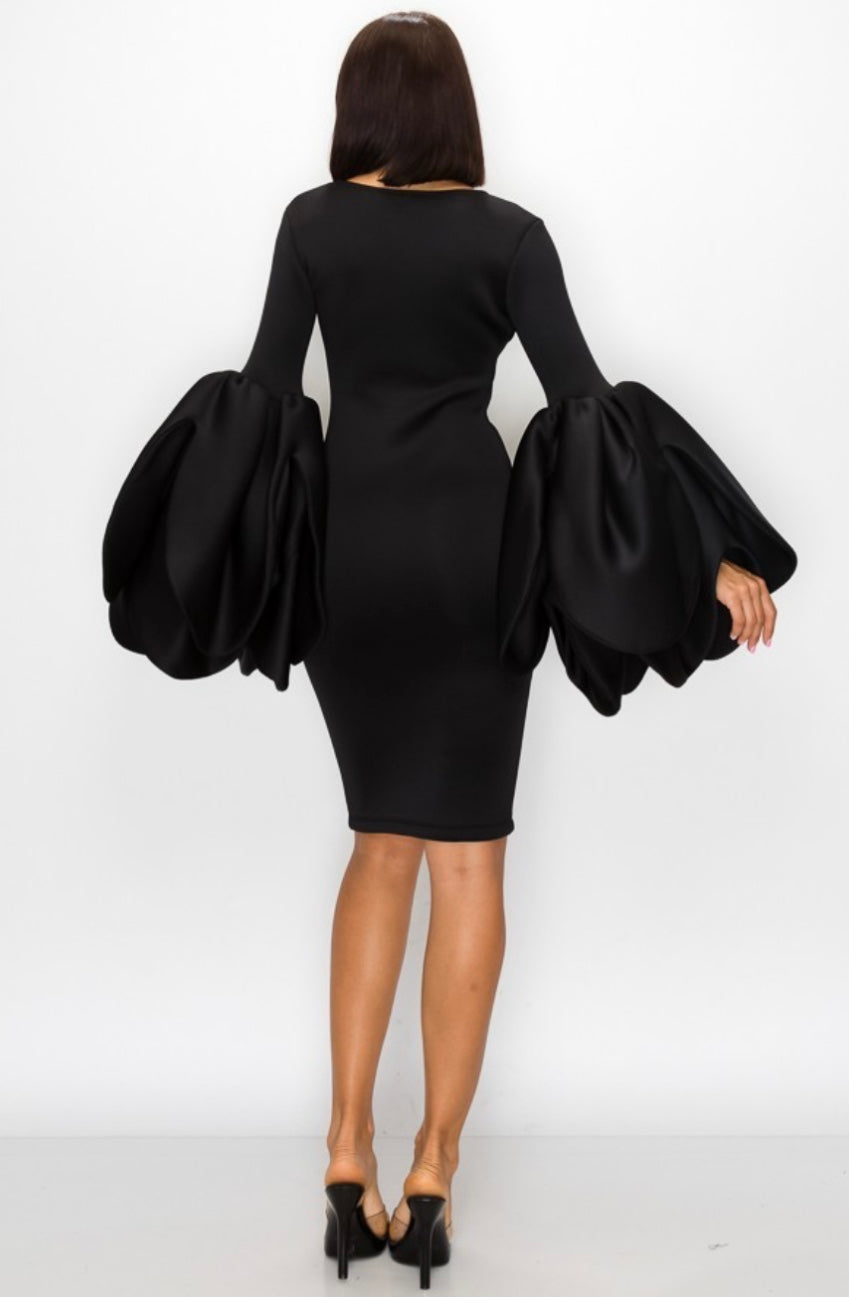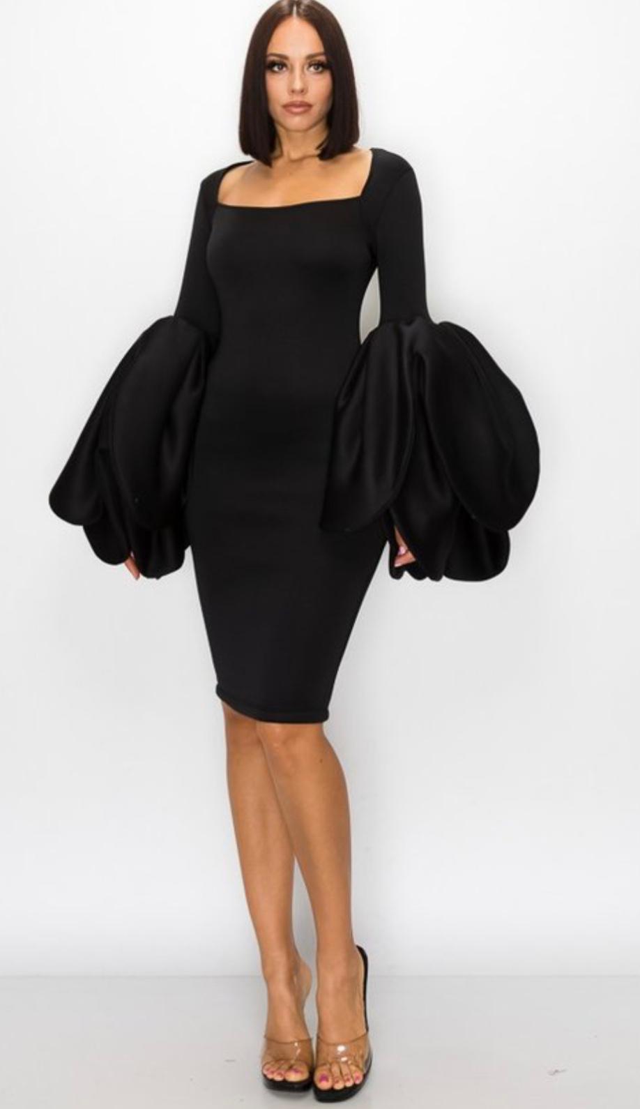 Hey Lady is a lovely form-fitting midi dress designed to turn heads. She features a modern square neckline and bold statement sleeves with sculptural volume, bringing high-fashion drama to a timeless black silhouette. The clean, tailored fit balances the exaggerated sleeves for a look that's confident, polished, and undeniably striking.