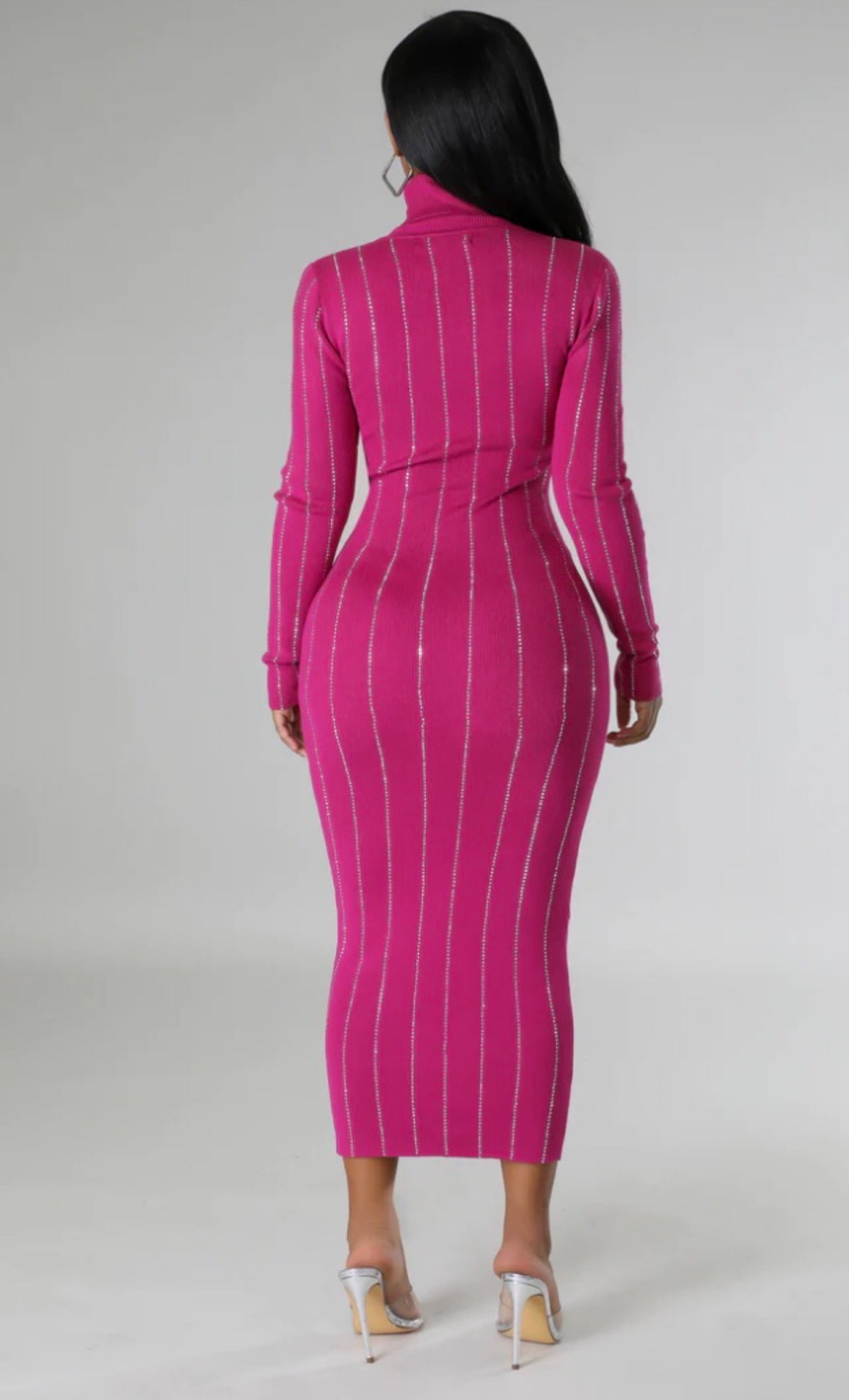 Turn heads in this beautiful magenta SPARKLE midi dress featuring a sleek turtleneck, long sleeves, and vertical shimmer stripes. Stretchy knit that elongate and flatters all curves. Perfect for nights out or a special occasion.